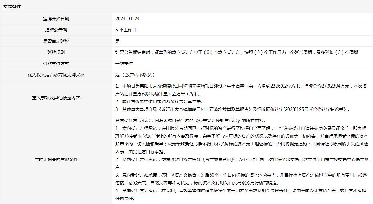 海陽市辛安鎮(zhèn)卓格莊村CX項目平整土地產(chǎn)生部分渣土一宗(1號標(biāo)的)交易公告